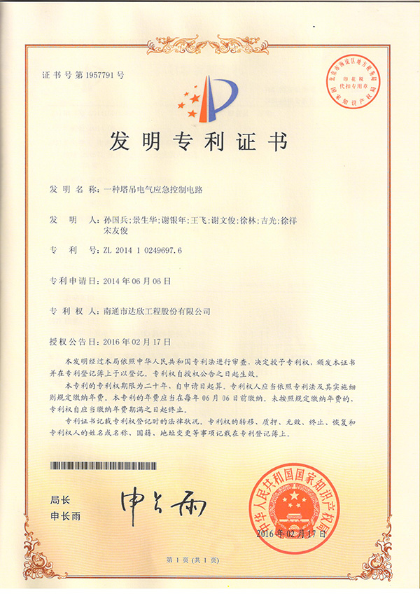 【另 訊】:由第五工程公司2014年6月申報(bào)的《一種塔吊電氣應(yīng)急控制電路》,于2016年2月17日獲得國家知識產(chǎn)權(quán)局授權(quán)的發(fā)明專利證書。