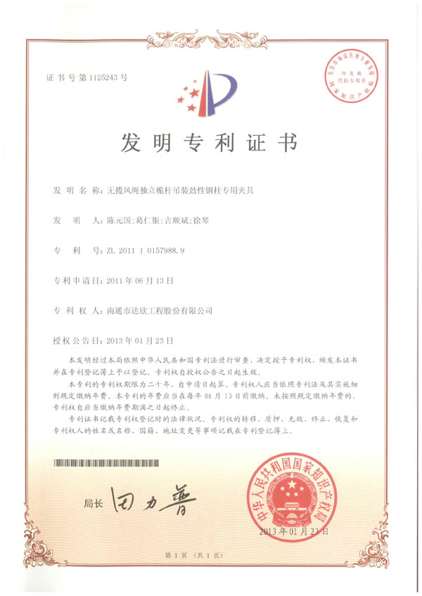 國家知識產(chǎn)權(quán)局對我公司申報的專利成果“無攬風繩獨立桅桿吊裝勁性鋼柱專用夾具”,授予了發(fā)明型專利證書,這是我公司首次獲得此類型專利,標志著公司專利成果的水平躍上新的臺階。