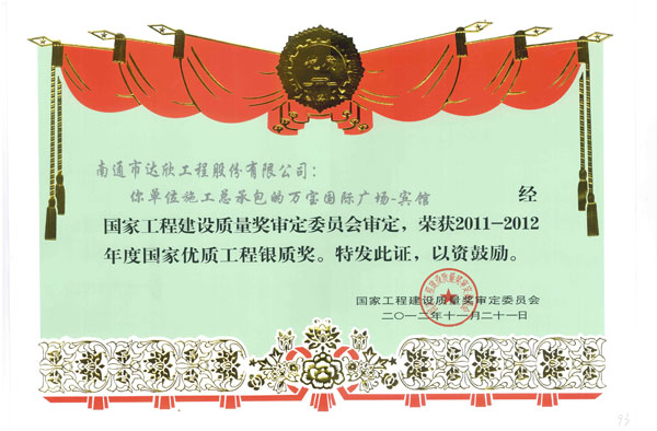 我公司總承包施工的上?!叭f寶國際廣場-賓館”作為主申報單位,在先后獲得上海市“節(jié)約型”樣板工地、上海市優(yōu)質結構工程、上海市“白玉蘭”優(yōu)質工程后,經上海市建筑施工行業(yè)協會推薦,經國優(yōu)專家組現場檢查,評審委員會評審,最終榮獲了2011-2012年度國家優(yōu)質工程銀質獎。上海萬寶國際廣場-賓館項目是自公司易名以來,首次以“達欣股份”為主體的總承包申報項目。