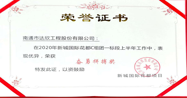 近日,新城國際花都C組團一、二標段項目,在公司各級領(lǐng)導的關(guān)心支持下,在項目全體施工人員的共同努力下,提前實現(xiàn)交付。為此,獲得長沙新城萬博置業(yè)有限公司工程授予的《奮勇拼搏》、《最佳合作》兩個獎項,博得了新城萬博置業(yè)有限公司對我司工作的高度認可。
