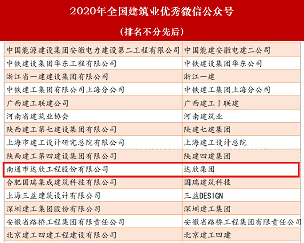 近日,由建筑時報社主辦的2020年建筑業(yè)微信公眾號運維經(jīng)驗交流研討會暨2020年全國建筑業(yè)優(yōu)秀微信公眾號頒獎典禮在揚(yáng)州召開。會上,公布了2020年全國建筑業(yè)“最具影響力”微信公眾號和2020年全國建筑業(yè)優(yōu)秀微信公眾號榜單。達(dá)欣集團(tuán)獲得2020年全國建筑業(yè)優(yōu)秀微信公眾號。