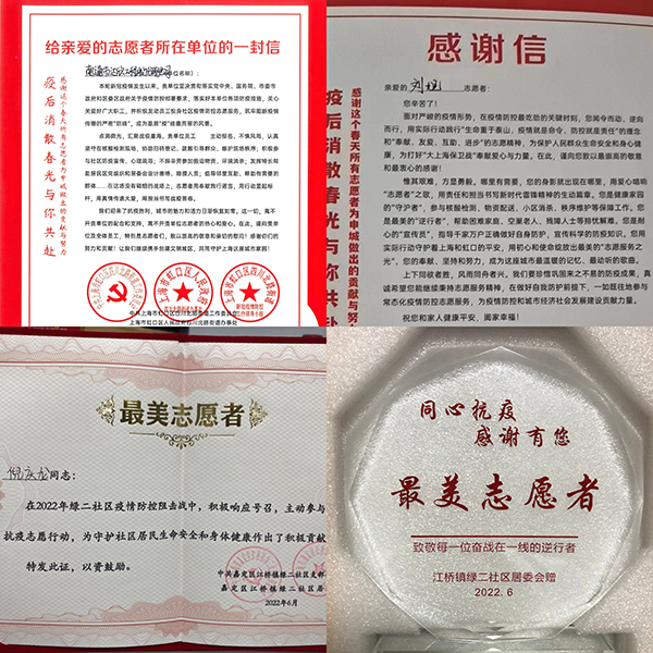近日,公司陸續(xù)收到來自中共上海市虹口區(qū)四川北路街道工作委員會、街道辦事處、新冠疫情防控工作領(lǐng)導(dǎo)小組對集團第一工程公司廣大職工、第八工程公司劉旭,以及中共嘉定區(qū)江橋鎮(zhèn)綠二社區(qū)對第八工程公司倪慶龍,在上海疫情期間,積極投身社區(qū)疫情防控志愿服務(wù),不懼風(fēng)雨、不辭辛苦,始終堅守助力打贏上海疫情阻擊戰(zhàn)的基層戰(zhàn)場,所展現(xiàn)出的大愛、擔(dān)當、奉獻精神,表示感謝和慰問。倪慶龍獲得“最美志愿者”稱號。