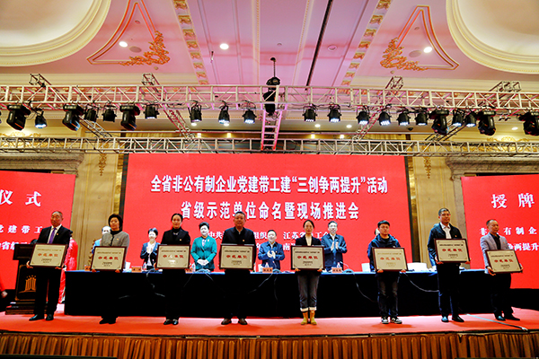 11月18日,江蘇省非公有制企業(yè)黨建帶工建“三創(chuàng)爭兩提升”活動省級示范單位命名暨現(xiàn)場推進會在南通召開。會上,對100家江蘇省非公有制企業(yè)黨建帶工建“三創(chuàng)爭兩提升”活動示范單位進行了命名,達欣集團榜上有名,集團副總經(jīng)理、工會主席溫鶴華作為單位代表上臺接受授牌。