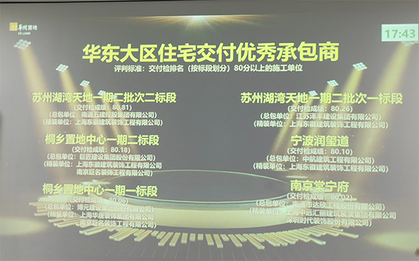 2月4日,華潤(rùn)置地華東大區(qū)召開(kāi)2022年度工作表彰大會(huì),第一工程公司承建的棠寧府項(xiàng)目榮獲“華東大區(qū)住宅交付優(yōu)秀承包商”、“華東大區(qū)優(yōu)秀交付項(xiàng)目金獎(jiǎng)”、項(xiàng)目經(jīng)理崔益明獲得“優(yōu)秀施工單位項(xiàng)目經(jīng)理”。