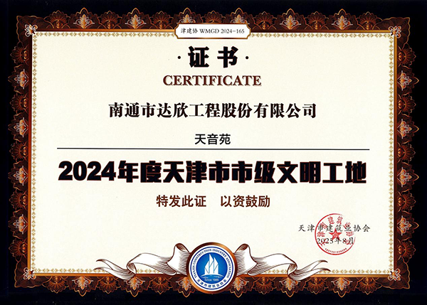 近日,天津市建筑業(yè)協(xié)會發(fā)布了津建協(xié)〔2025〕9號關(guān)于公布2024年度天津市文明施工示范工地和天津市市級文明工地通過工程的名單,第六工程公司承建的天音苑項目被授予“2024年度天津市市級文明工地”稱號。