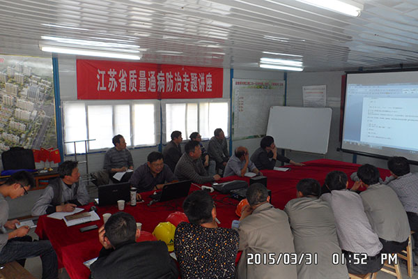 第九工程公司技術(shù)負(fù)責(zé)人楊本榮進(jìn)行了主講。培訓(xùn)重點(diǎn)圍繞《江蘇省質(zhì)量通病防治》手冊(cè),圖文并茂的講解,使大家對(duì)工程中存在的質(zhì)量通病的防治有了進(jìn)一步的了解和認(rèn)識(shí),同時(shí)針對(duì)祥河灣項(xiàng)目檢查存在的質(zhì)量問題,楊本榮同志還進(jìn)行了耐心細(xì)致的原因分析及拿出了解決方案。
