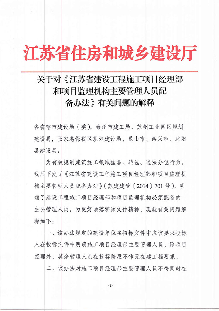 關(guān)于對(duì)《江蘇省建設(shè)工程施工項(xiàng)目經(jīng)理部和項(xiàng)目監(jiān)理機(jī)構(gòu)主要管理人員配備辦法》有關(guān)問題的解釋